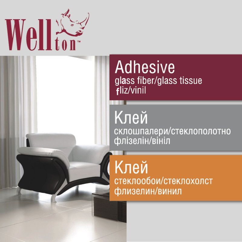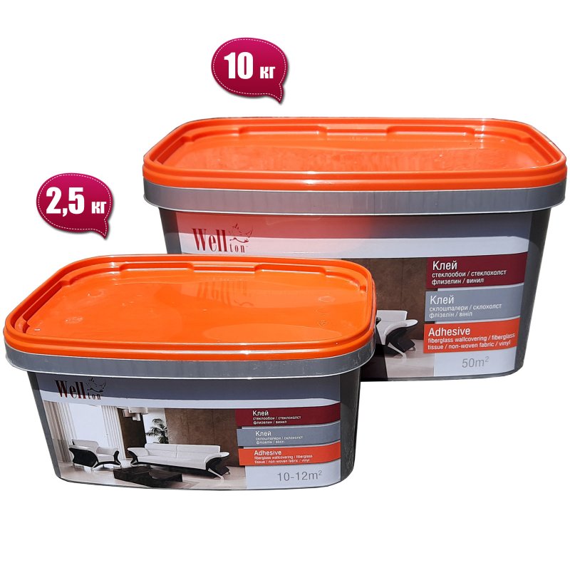 Готовий до застосування клей "Wellton" - преміальний продукт в асортименті клею для склошпалер, малярних склополотнів, флізеліну та інших видів шпалер. Вага нетто – 2,5 кг.
