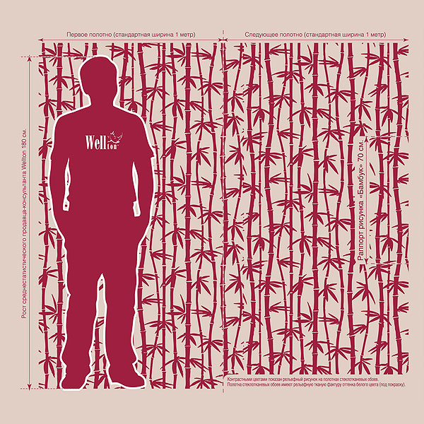 Ця фактура склотканинних шпалер здатна перетворити будь-яке приміщення на екзотичний бамбуковий гай - настільки точно передана структура стебел і листя цієї рослини. Відмінно підходить для виділення декоративних зон у приміщенні. Рапорт 70 см.