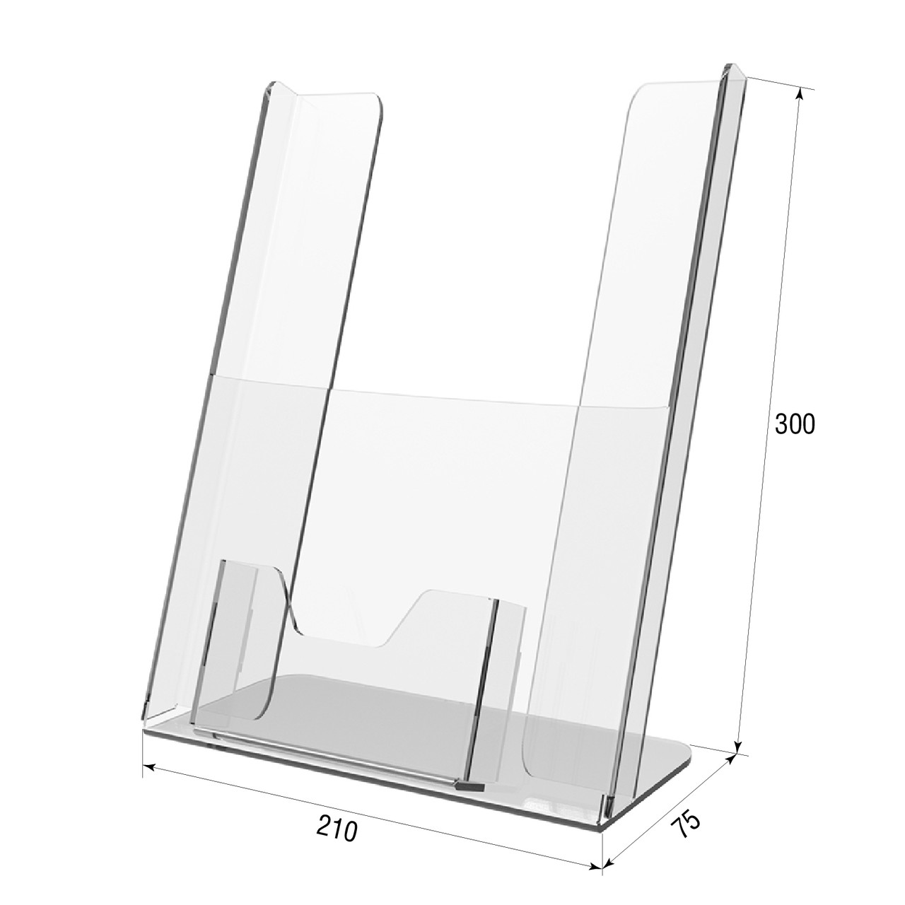 Міцність та довговічність: Виготовлена з високоякісного акрилу, буклетниця має відмінну стійкість до ударів, подряпин та пошкоджень, що гарантує її довговічність.