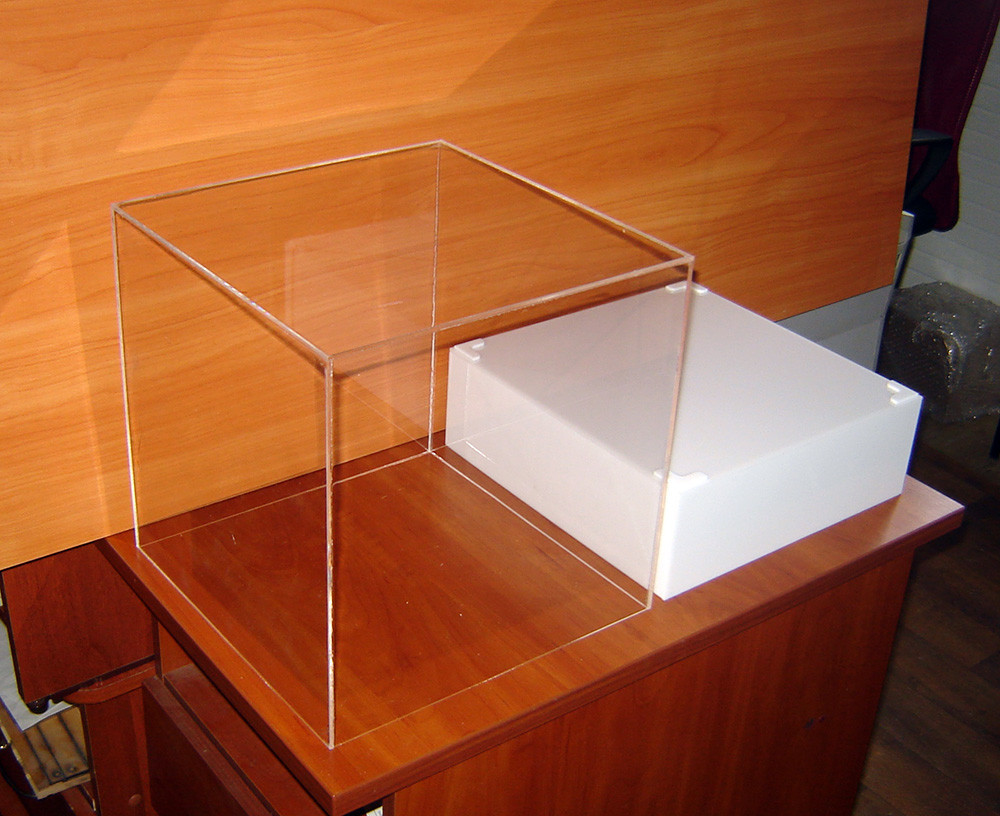 Колпак (короб) на товар або макет. Розміри прозорої частини 300x300x300мм. Розміри нижньої подіуму 300x300х100м. Матеріал - оргстекло (акуріл) 3м прозоре або молочне. Колись виготовляли під квіткові букети.