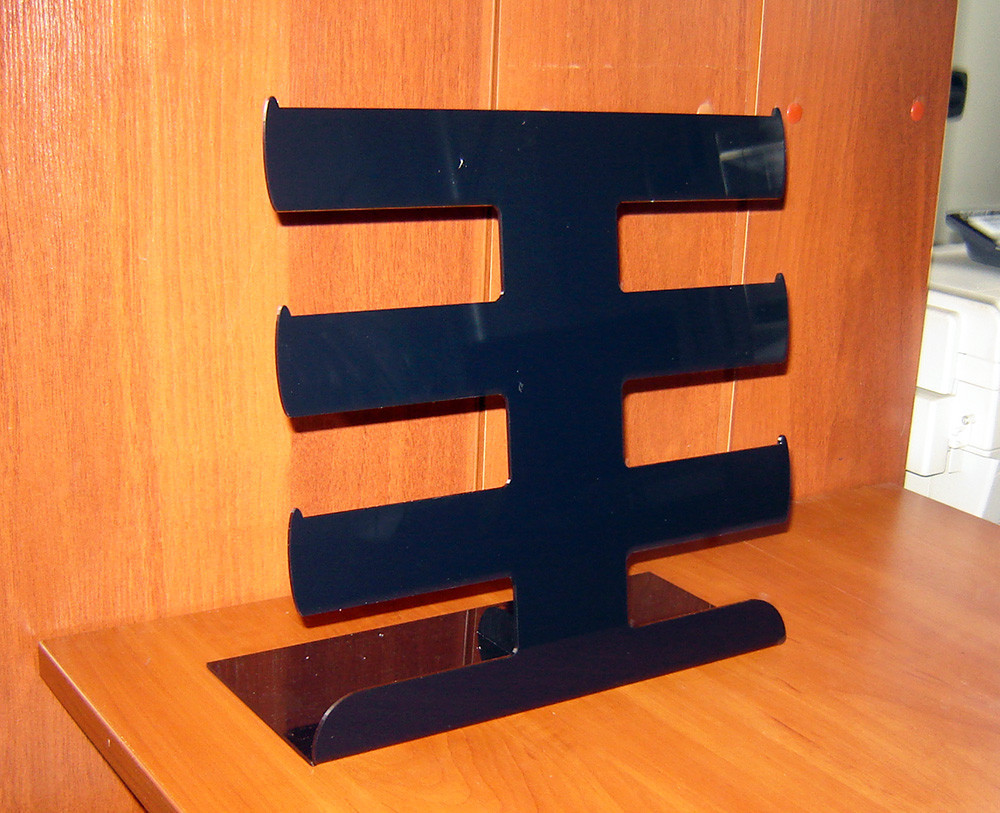 Підставка під браслети 3-х ярусна. Матеріал - оргскло (акрил) 3мм чорне. Габаритна ширина 310мм, висота 295мм. На задній частині підклеєно куточок підсилювач.