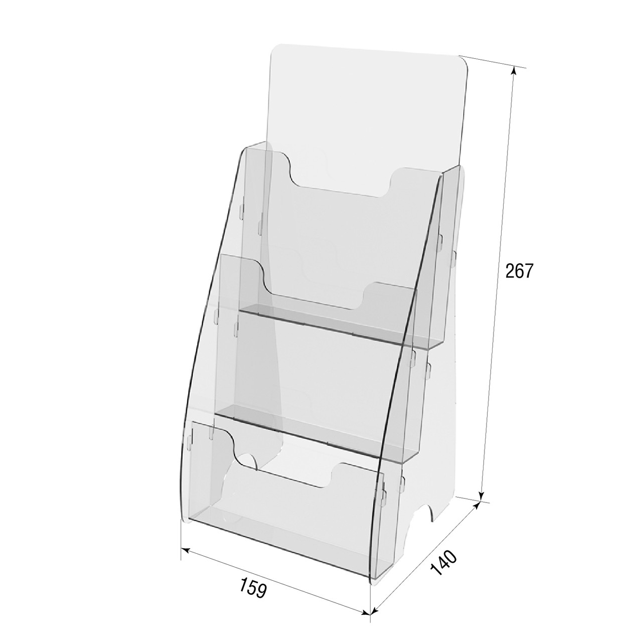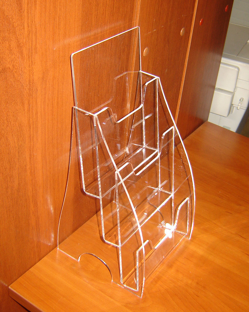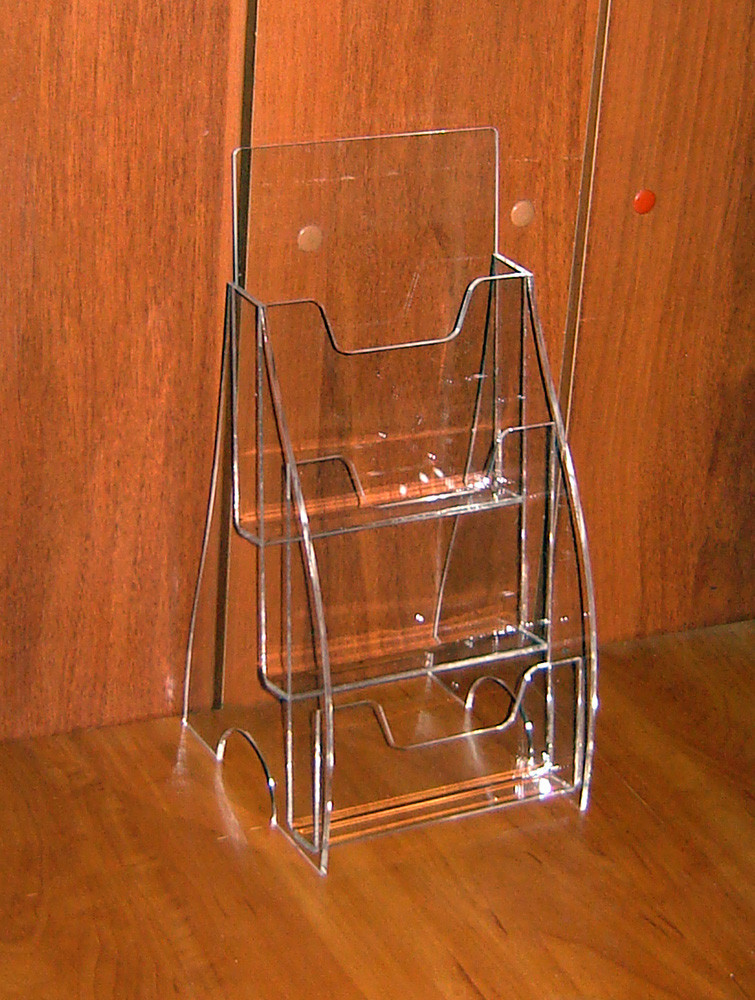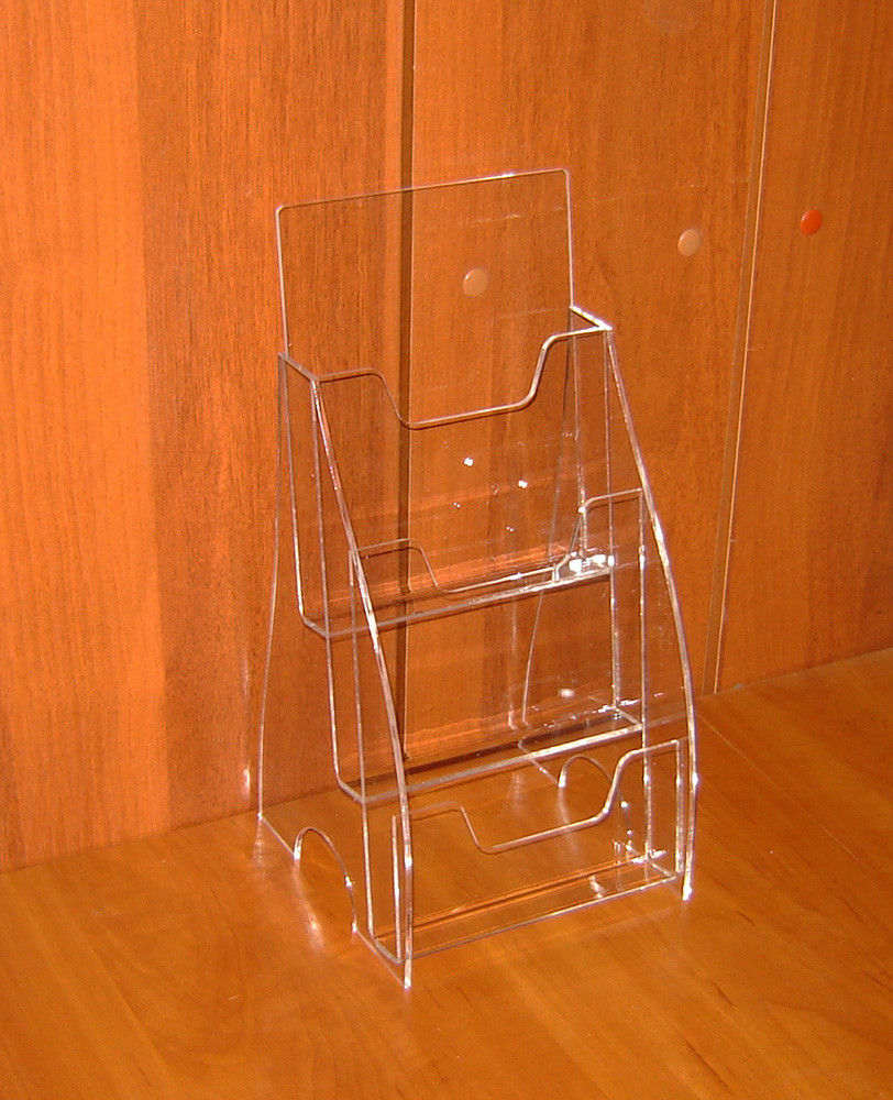 Підставка під буклети А5 3-х ярусна. Матеріал - оргскло (акрил) 2мм прозоре. Метод виробництва - склейка (не розбірна монолітна конструкція). Внутрішня ширина 155мм, глибина ярусу - 25мм.