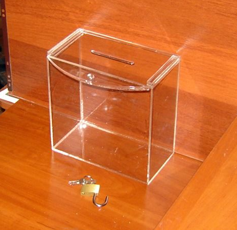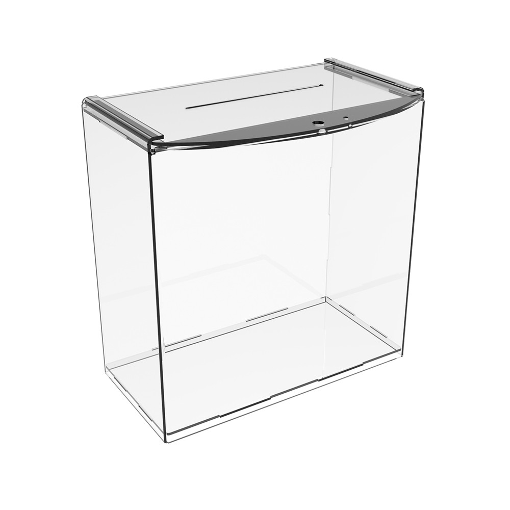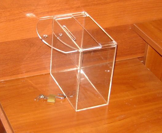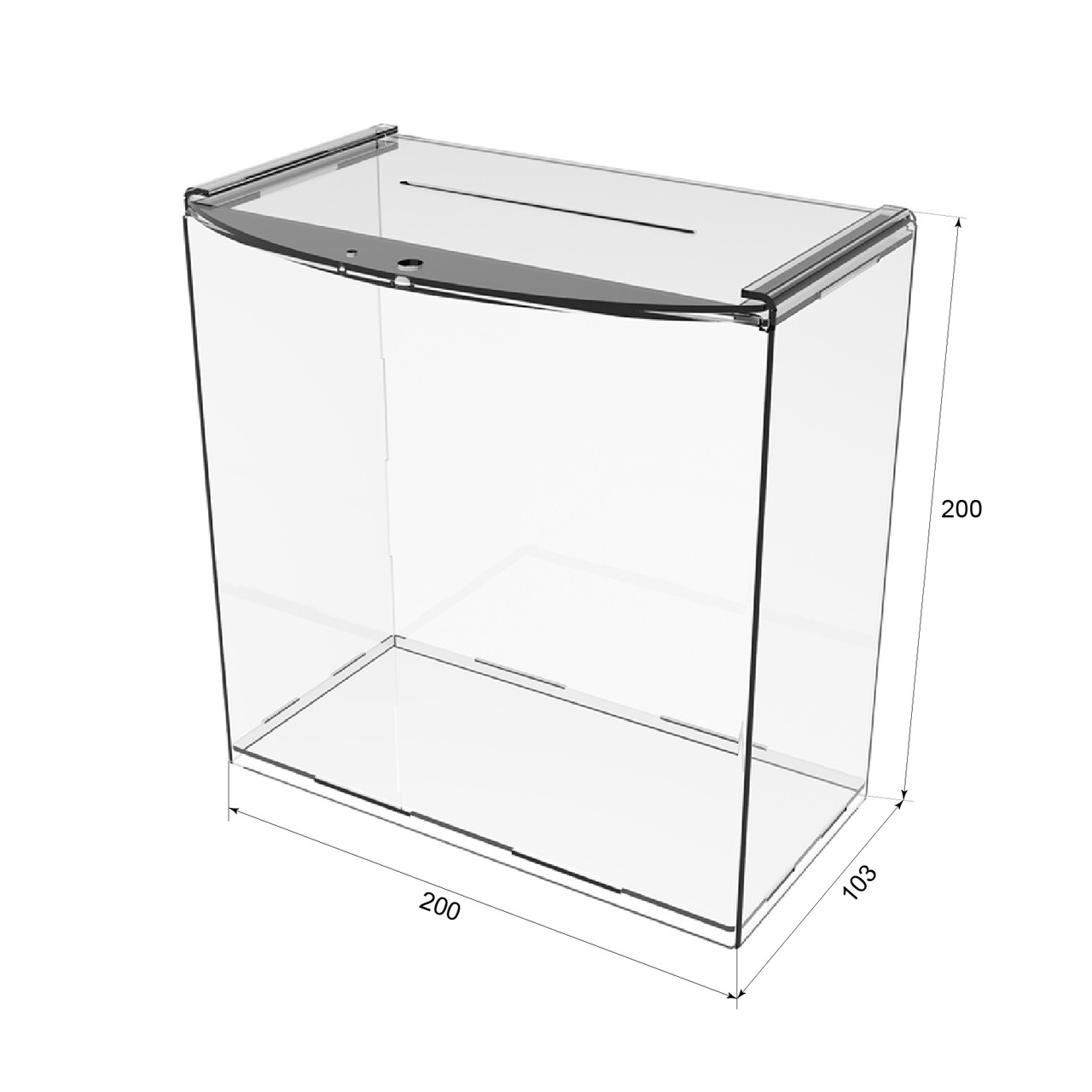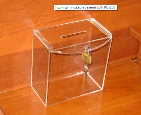 Ящик для пожертвувань 200х103х200. Матеріал ― оргскло (акрил) 2мм прозоре. Передбачено вушко для навісного замку. Кришка відкривається зрушенням в пазах вперед.