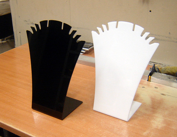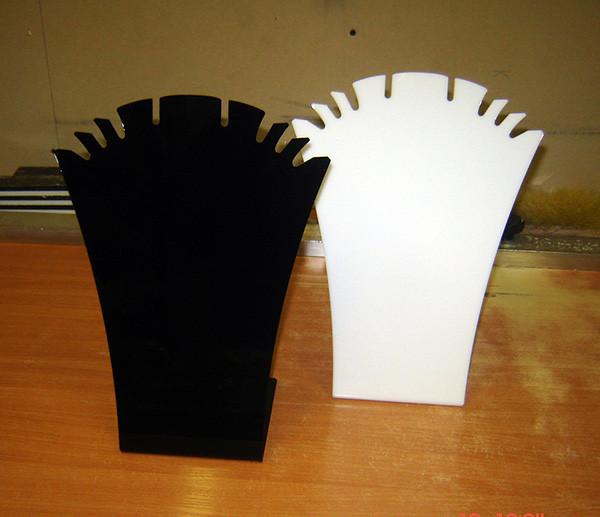 Підставка під кольє №4 з оргскла 3мм молочного, чорного матового. Висота робочої частини 280 мм, ширина 205мм.